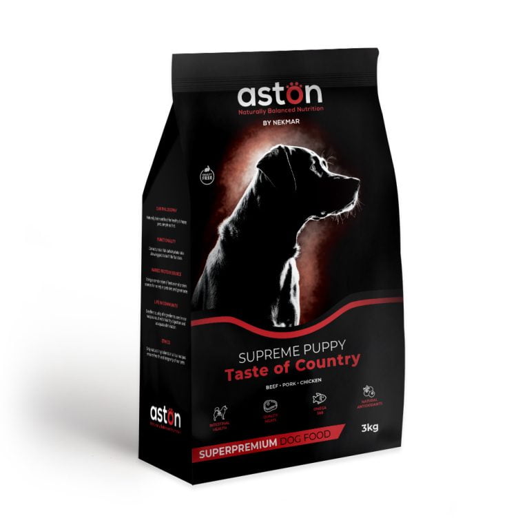 Aston Supreme Puppy Taste of Country hrana za pse u pakiranju od 3 kg sadrži dehidrirano meso (piletina 16%, govedina 12%, svinjetina 12%), kukuruz, pileću masnoću, grašak, laneno sjeme, sušenu repinu pulpu, kvasce, minerale i vitamine. Analitički sastav uključuje sirove proteine (29,5%), sirove ulja i masti (21%), sirova vlakna (2,6%), pepeo (8%) i vlagu (8%).