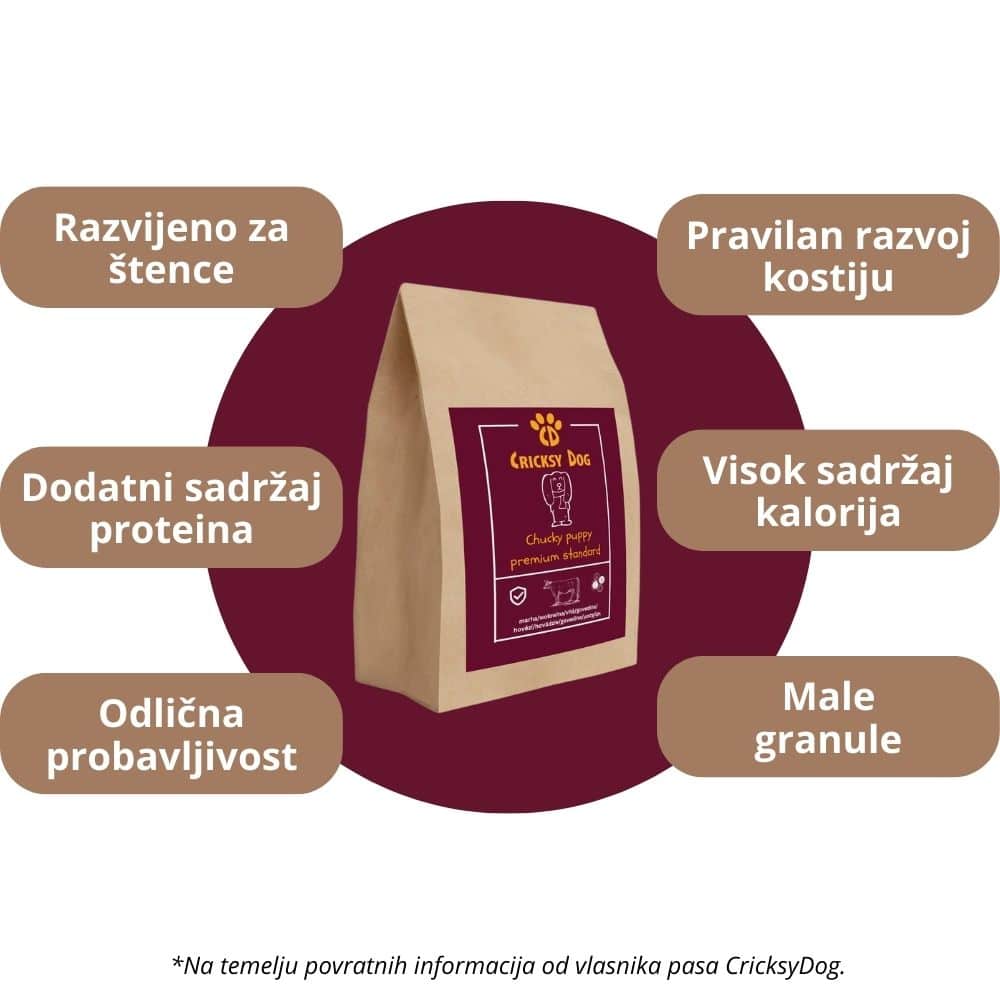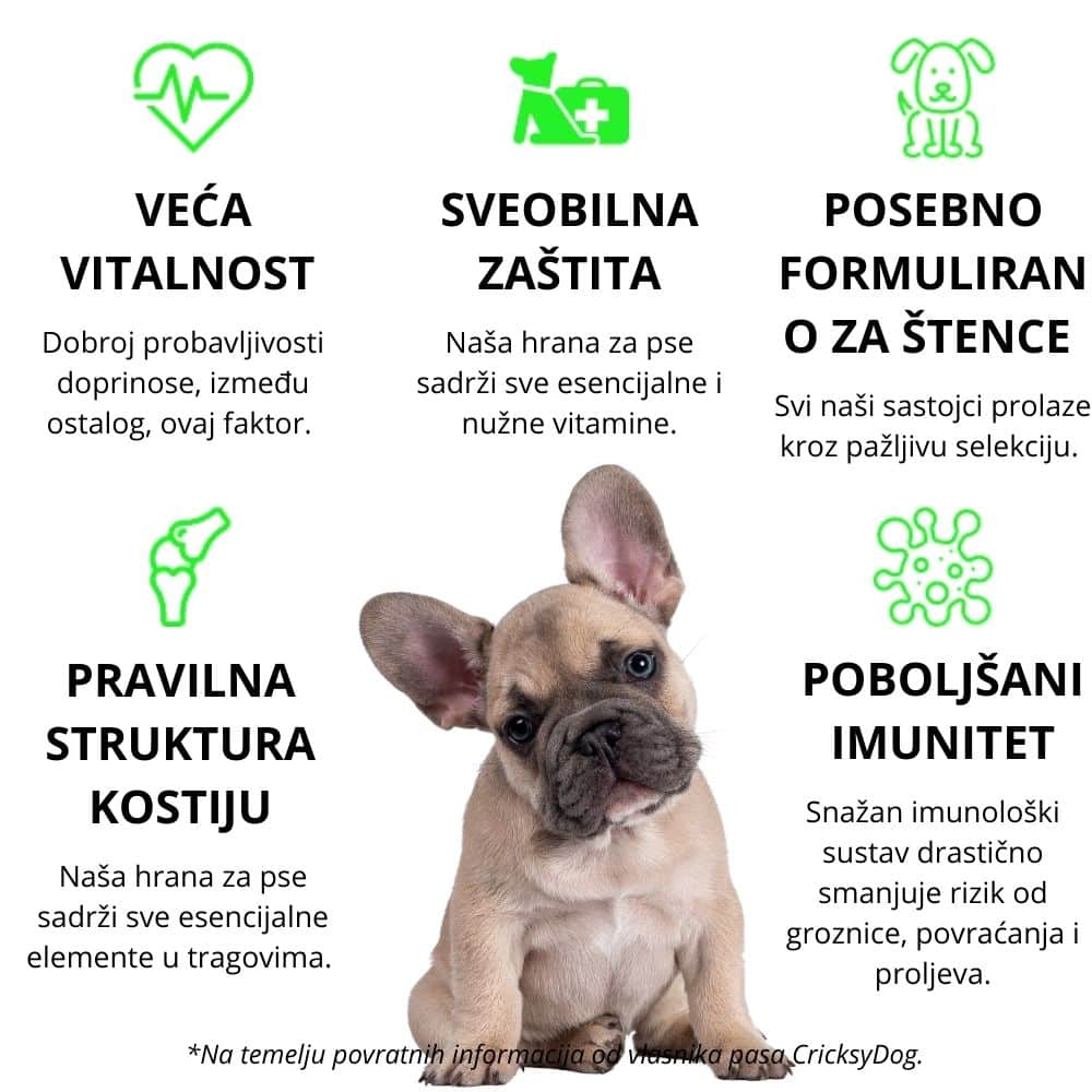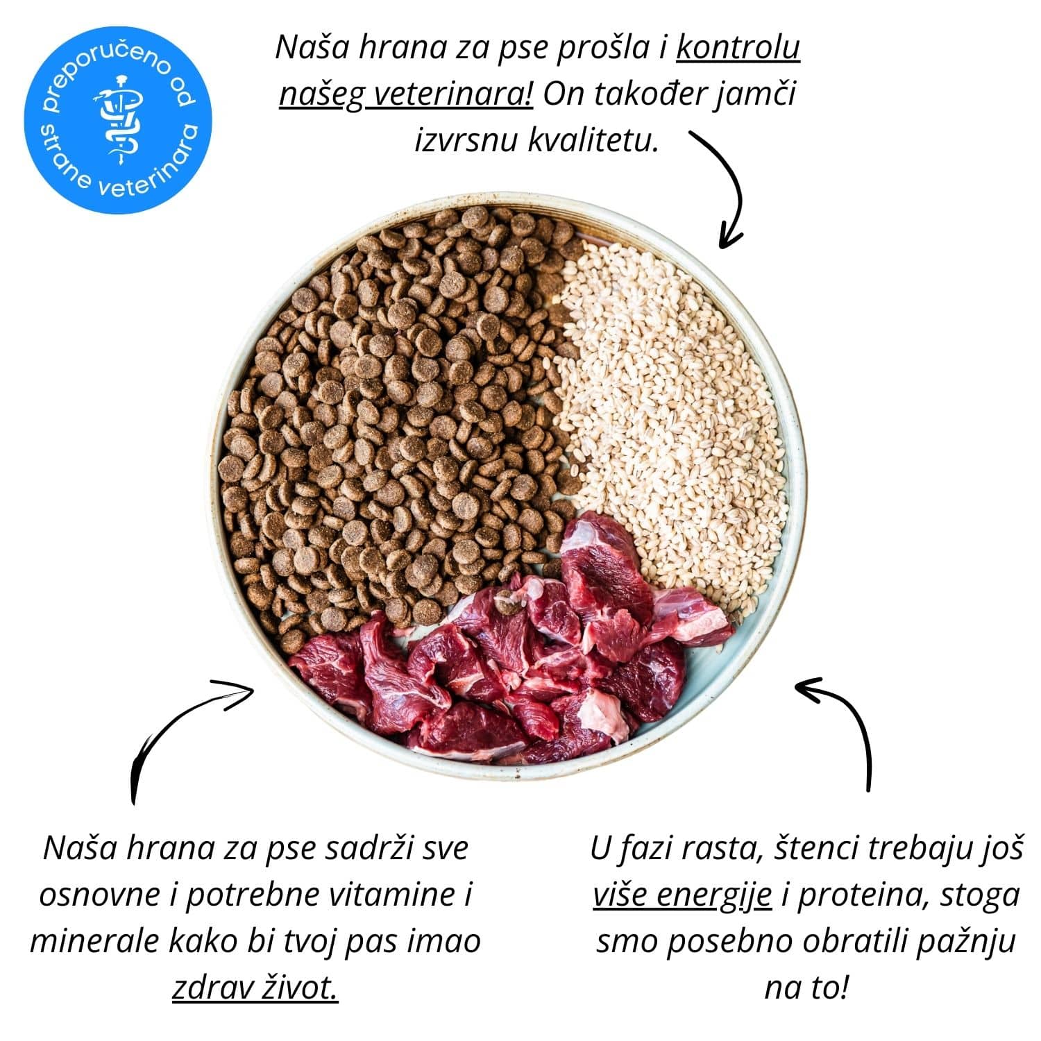 - Pruža sve potrebne nutrijente za zdrav razvoj štenaca.
