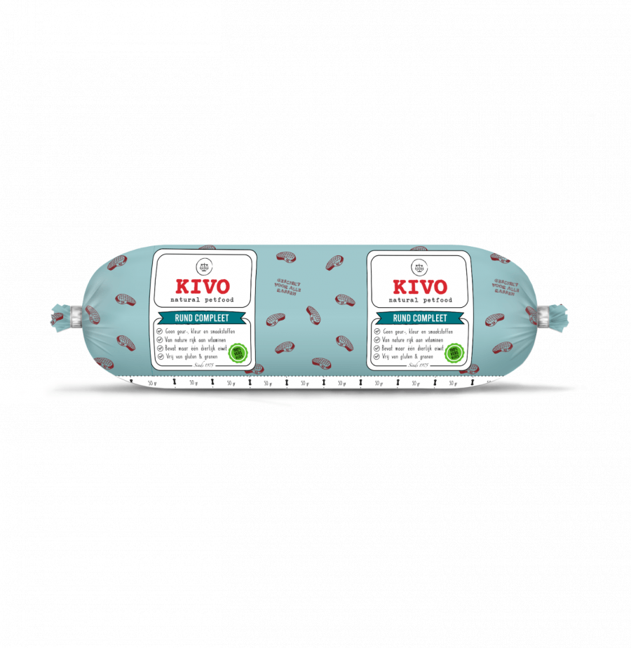 KIVO Barf kompletan MONO govedina je sirova hrana za pse koja se sastoji od mesa koje je prikladno za ljudsku prehranu. Koristi se meso kategorije 3 – vrat, prsa, rebra, stražnjica, bez nusproizvoda mesa. Ova cjelovita i uravnotežena formula je MONOPROTEIN obrok, sa samo jednim izvorom životinjskih proteina. Sadrži prirodno prisutne hondroitin i glukozamin, te je pakirana u kobasice po povoljnoj cijeni. KIVO Barf MONO govedina je idealan izbor za vašeg psa!