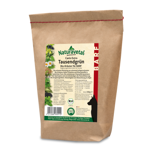 Canis Extra mješavina začinskog bilja Bio BARF je pažljivo osušena mješavina organskog začinskog bilja, bogata vitaminima, mineralima i fitokemikalijama. Ova mješavina je idealna za proljetnu ili jesensku kuru, čišćenje crijeva, detoksikaciju, promjenu krzna, pse s kroničnim manjkima ili kao dodatak uravnoteženoj prehrani. Sastav uključuje sušeni maslačak, melisu, kadulju, kamilicu, crni kim, artičoku, tulsi, vrisak, crni ribiz, mažuran, koprivu, anis, origano i kopar. Svi sastojci su organskog porijekla.